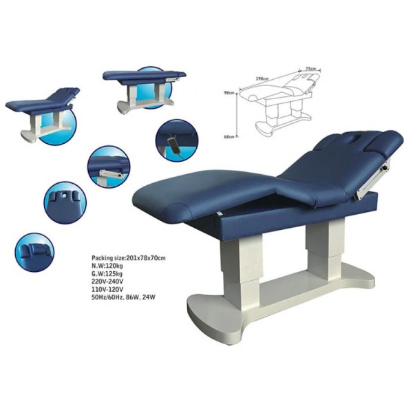 Несколько электромоторов позволяют легко изменить высоту стола, наклон отдельных секций и даже превратить в комфортабельное косметологическое кресло. Все регулировки проводятся с помощью пульта ДУ и не вызывают никаких затруднений.